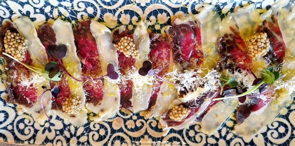 Carpaccio de picaña curada en casa con tostas de croissant y mantequilla compuesta