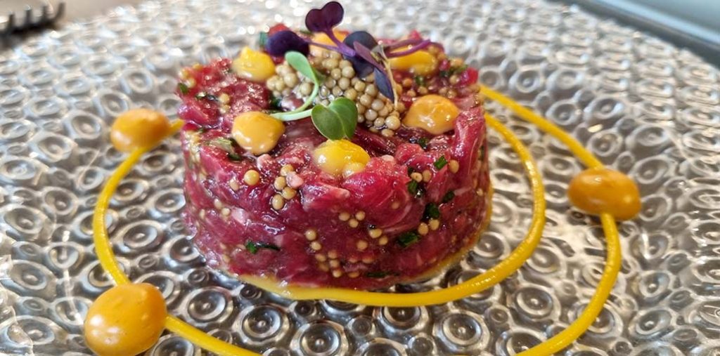 Steak tartar de solomillo, crema de yema y encurtidos