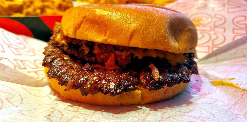 BBQ Bacon Chesseburger: Doble Smash Burger, Bacon crunchy, Cheddar, Pepinillo y Salsa BBQ en Pan Brioche