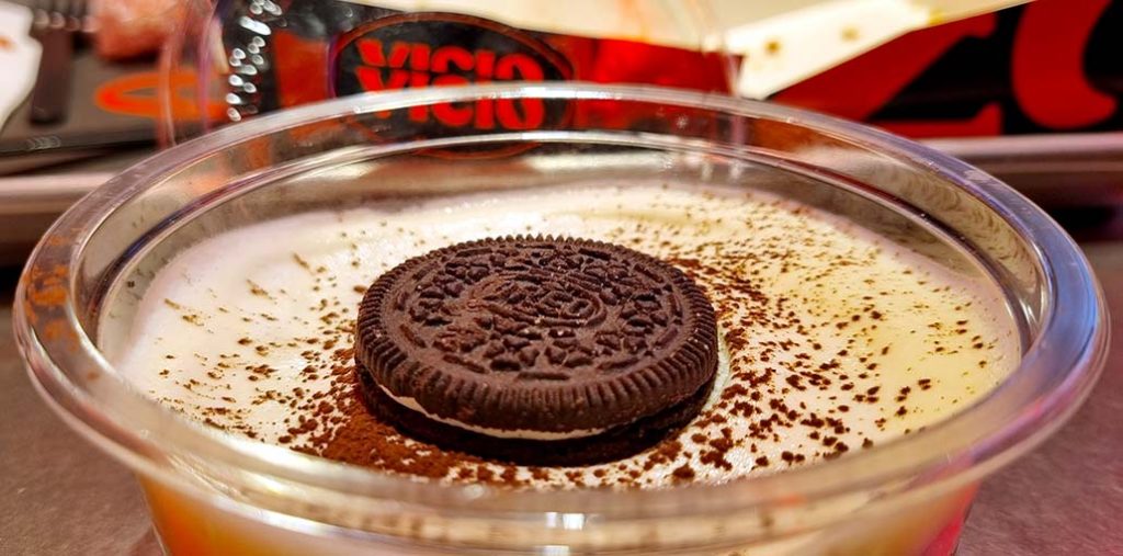 Tiramisú de Oreo: Crema de Mascarpone mezclada con Galletas Oreo y Lluvia de Cacao en Polvo