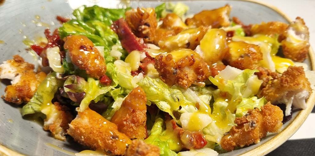 Ensalada Zabaleta Berri (mezcla de lechugas, tomate seco, parmesano, pollo crujiente y aliño de miel y mostaza)
