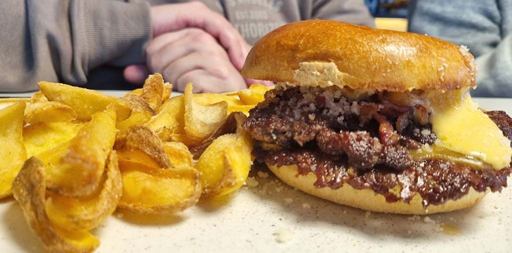 Doble hamburguesa Smash de ternera, con salsa carbonara, queso cheddar y guanciale