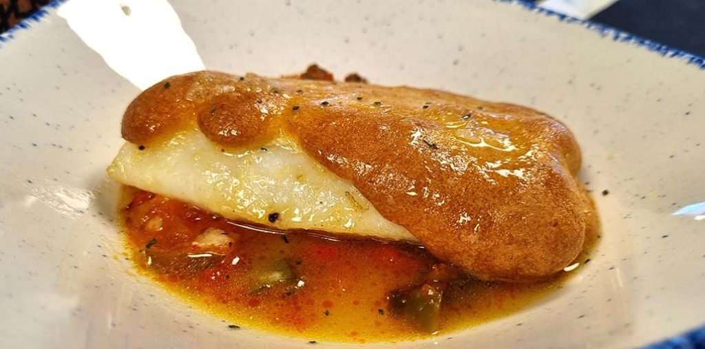 Bacalao gratinado con piperrada